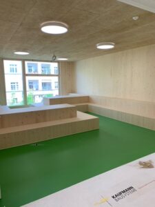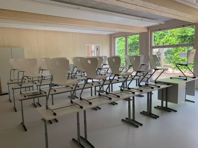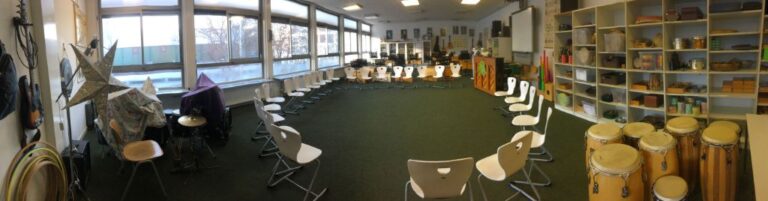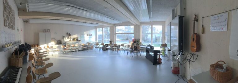 Dank des Neubaus verfügen wir über zwei großzügige Musikräume mit einer großen Anzahl an Instrumenten (Klavier, Schlagzeuge, Congas, Xylophone, Percussionsinstrumente und und und …)
