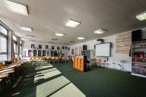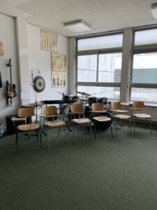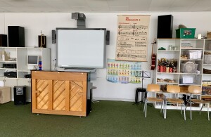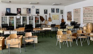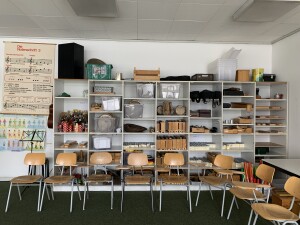 Der Musikunterricht kann in gut ausgestatteten Musikräumen (vielfältiges Instrumentarium, das gut gepflegt wird) oder im Mehrzweckraum mit Bühne und viel Platz zum Bewegen stattfinden.