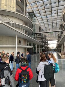 Die 6. Klassen erkunden beispielsweise den Arbeitsort der Abgeordneten- den Deutschen Bundestag. Unsere Abgeordneter, Thomas Heilmann, erklärt und stellt sich den Fragen. Auch bei den Wünschen hört er aufmerksam zu. „Der war echt nett.“ meinte eine Schülerin und ein Schüler stellte fest: „Ich dachte das sei voll langweilig, hat aber echt Spaß gemacht.“