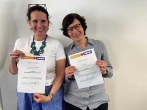Unsere Kolleginnen Anja Sokoll (r.) und Isabelle von Stechow (l.) haben die „Jahresfortbildung für Lehrkräfte in Willkommensklassen“ abgeschlossen.